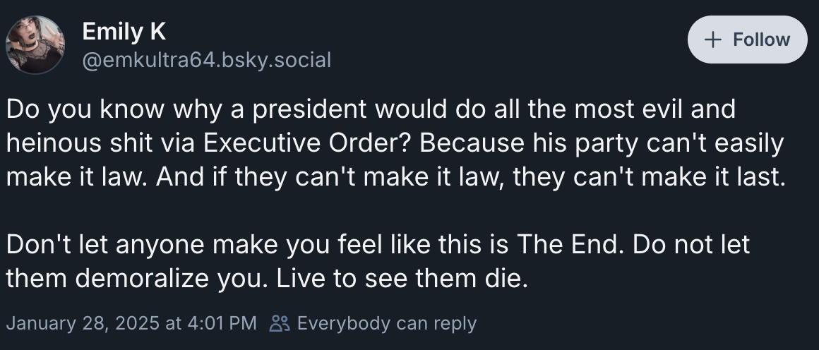 I’ll be honest with you: shit’s fucked. Elon Musk is orchestrating a coup of the financial levels of our country, Trump is rubber stamping highly illegal executive orders in accordance with the Project 2025 game plan, and the Democrats are doing what they do best: sitting around with their thumbs up their asses.