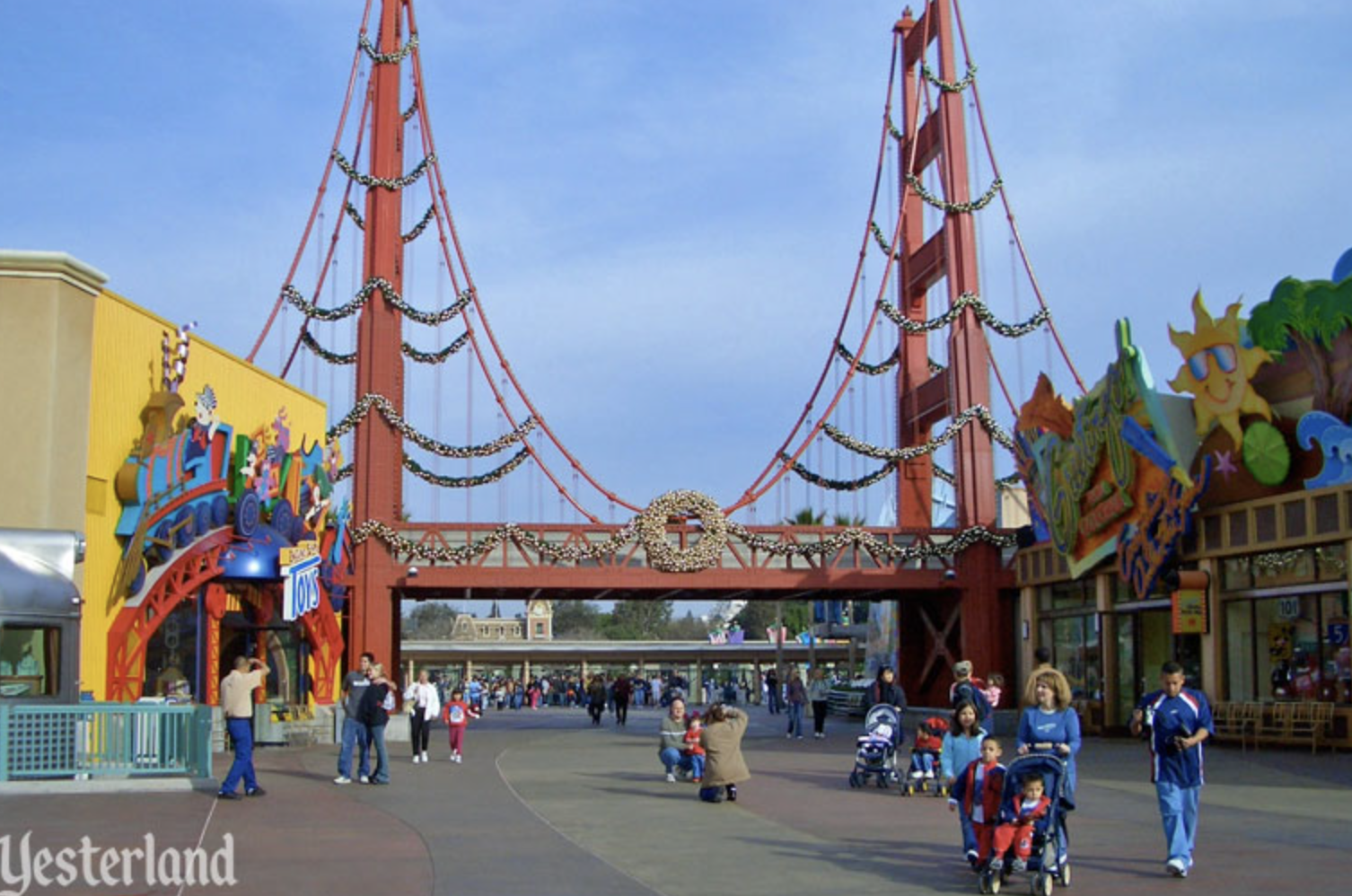 But I did love the extreme jankiness of the old entrance and entrance area, which was really out of step with what Disney Parks were at the time, and was most reminiscent of the old live-performance area of Tomorrowland from the 1980s and early 1990s. When you walked in, you walked under a squished version of the Golden Gate Bridge (which the monorail used to pass through; it doesn't even go to DCA now), and then it opened up into a wide, wide plaza with a shitty little stage that would occasionally hold a Beach Boys cover band but would mostly be empty. It sucked and I loved it. They don't even have the "C A L I F O R N I A" letters out front anymore. RIP California.